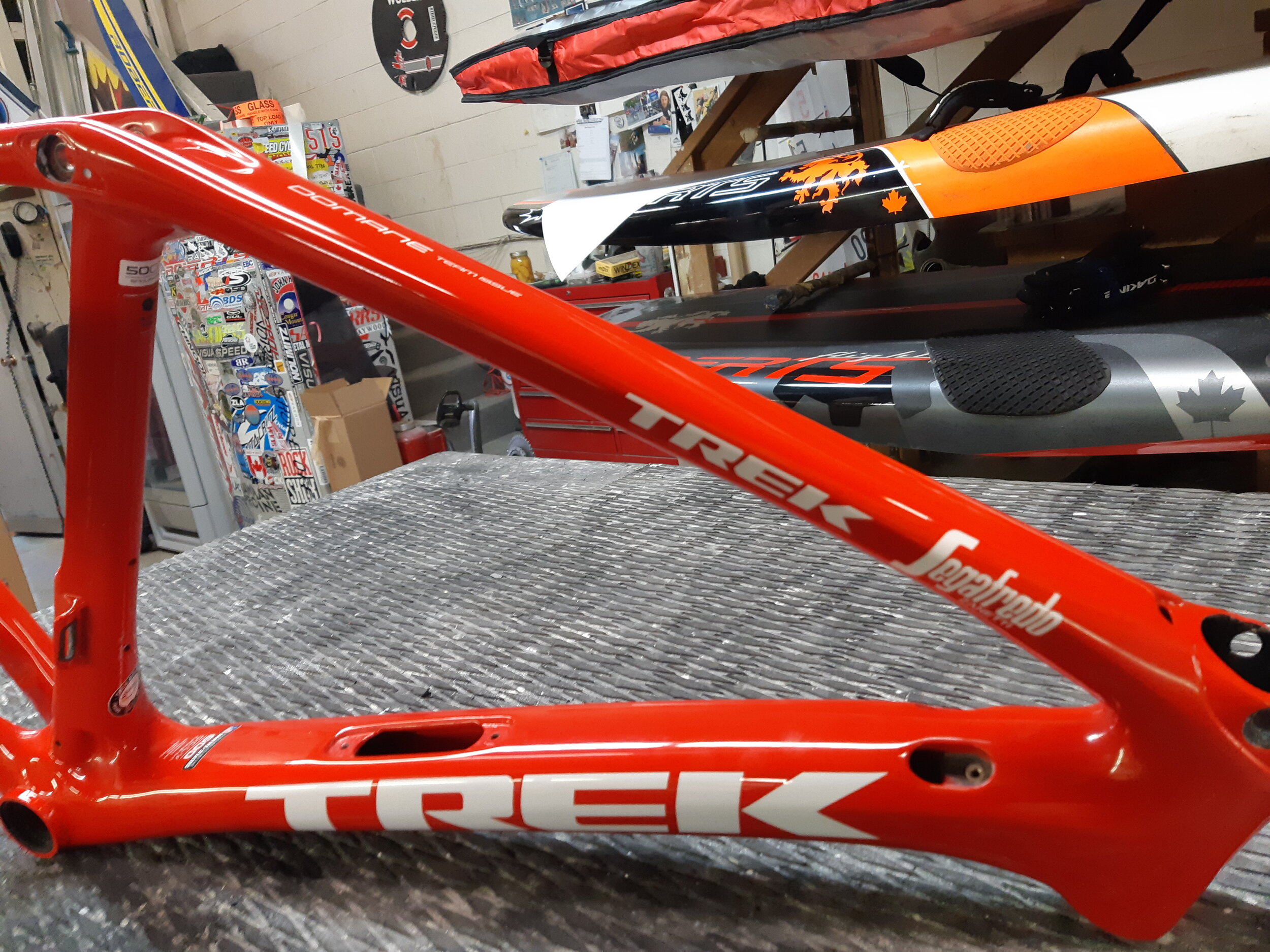 A Trek Domane receives the full treatment and has all of its graphics restored over a summit tube repair.